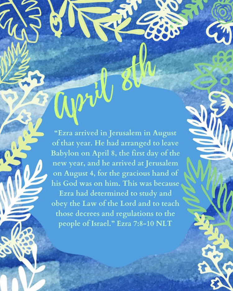 “He had arranged to leave Babylon on April 8, the first day of the new year, and he arrived at Jerusalem on August 4, for the gracious hand of his God was on him.” Ezra 7:9 NLT
